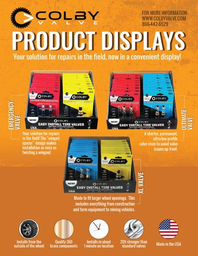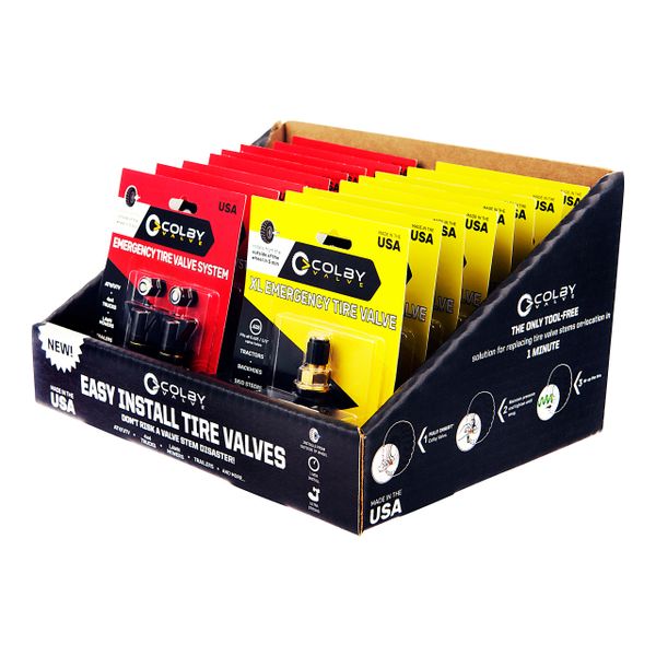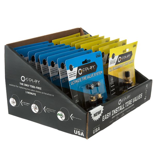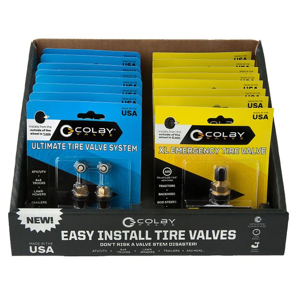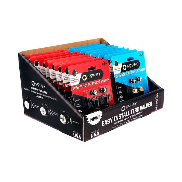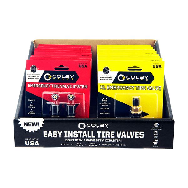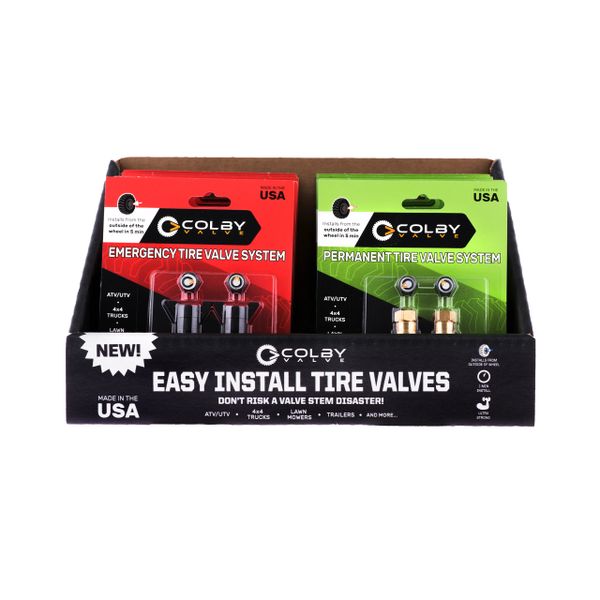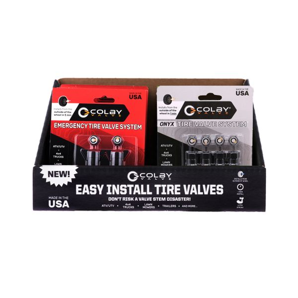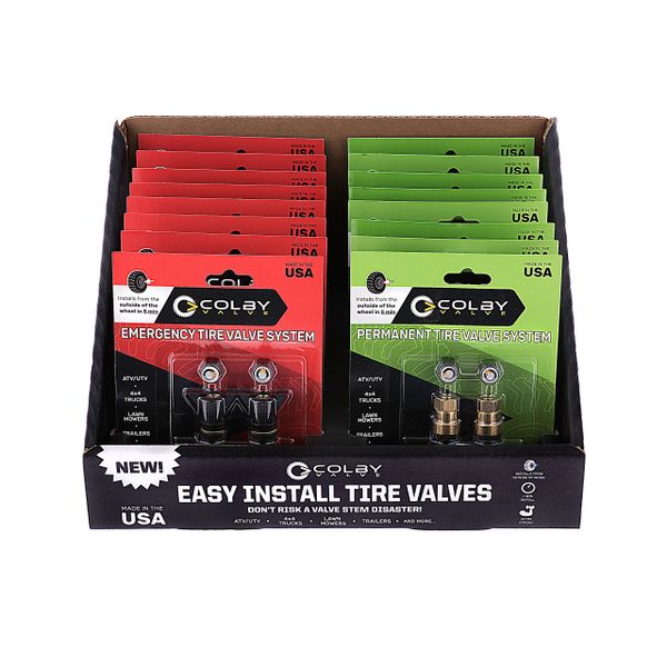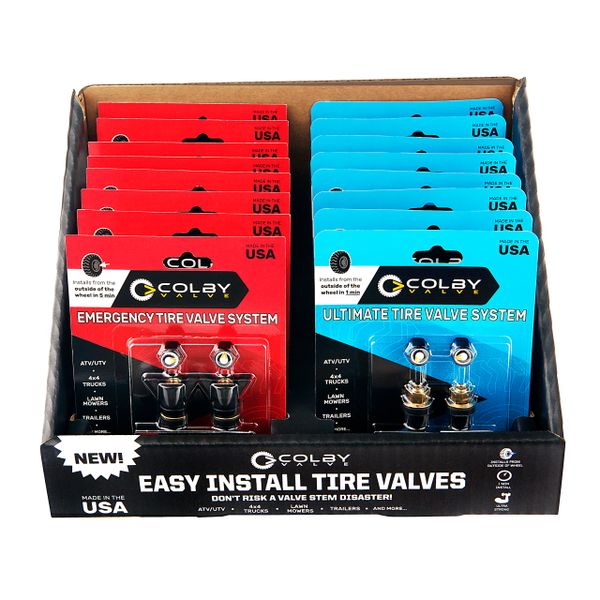 The perfect counter top display of replacement tire valves for the shop checkout, Jeep rental or ATV dealers.
