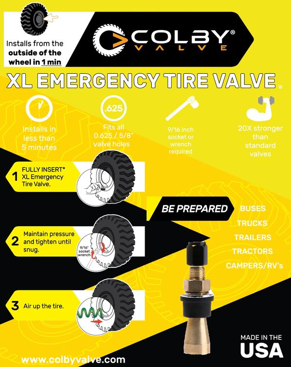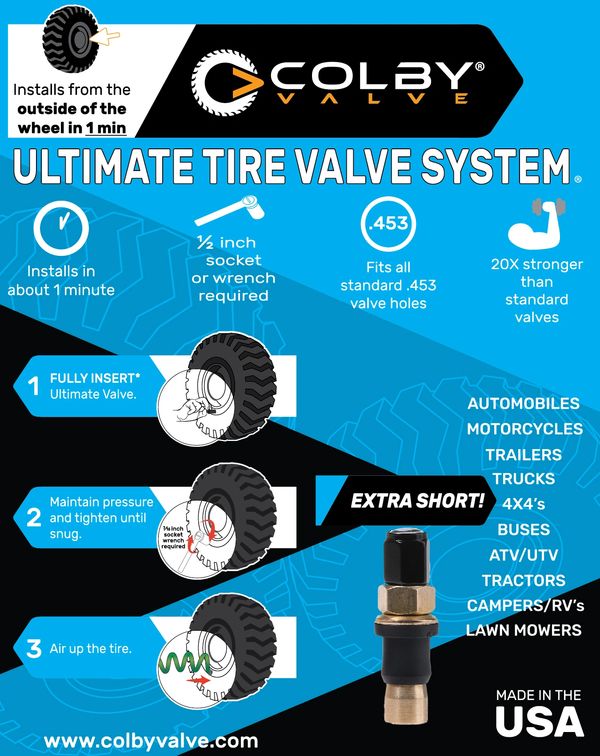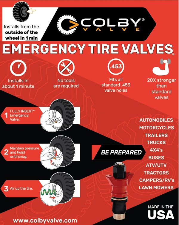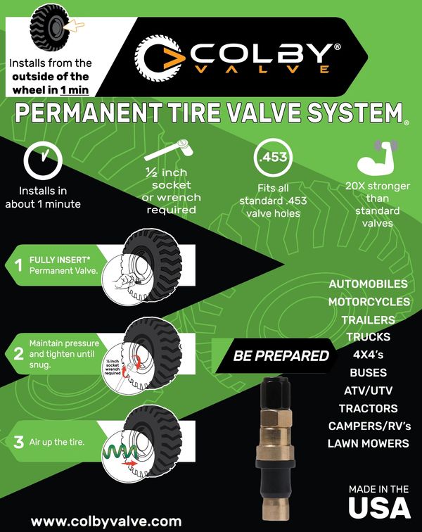 This amazing invention is a must have in every vehicle that sports tubeless tires. Don't pull out of the driveway, hit the highways or tackle the trails without at least one Emergency Colby Valve Tire Valve on board. Replace Emergency Tire Valves with a permanent option for the long haul.
